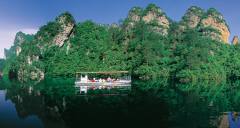 湖中有兩座疊翠小島,近岸奇峰屹立,峰回水轉(zhuǎn)。泛舟漫游,只見一湖綠水半湖倒影,充滿詩情畫意?!霸铺萑f丈上天臺(tái),高峽平湖一鑒開,王母瑤池金扶,浣沙仙女下凡來”游寶峰湖,你就會(huì)欣賞到這樣的詩情畫意。群峰擁抱的寶峰湖,長(zhǎng)約2.,5公里,湖猶如一面寶鏡,四面青山,一泓碧水,蕩槳溫游,格外愜意。坐在船上,環(huán)顧四周,千山聳翠,俯視水中,倒影慢移,碧水照相館得群峰綠,人面桃花水映紅。真是靜極了,美極了!