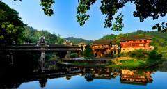 皇都侗寨由頭寨、盤寨、尾寨、新寨共同組成。前三個寨子連為一體,新寨則是處于一個半島上,由風(fēng)雨橋(普修橋)和公路相通,與另三個寨子隔河相望。